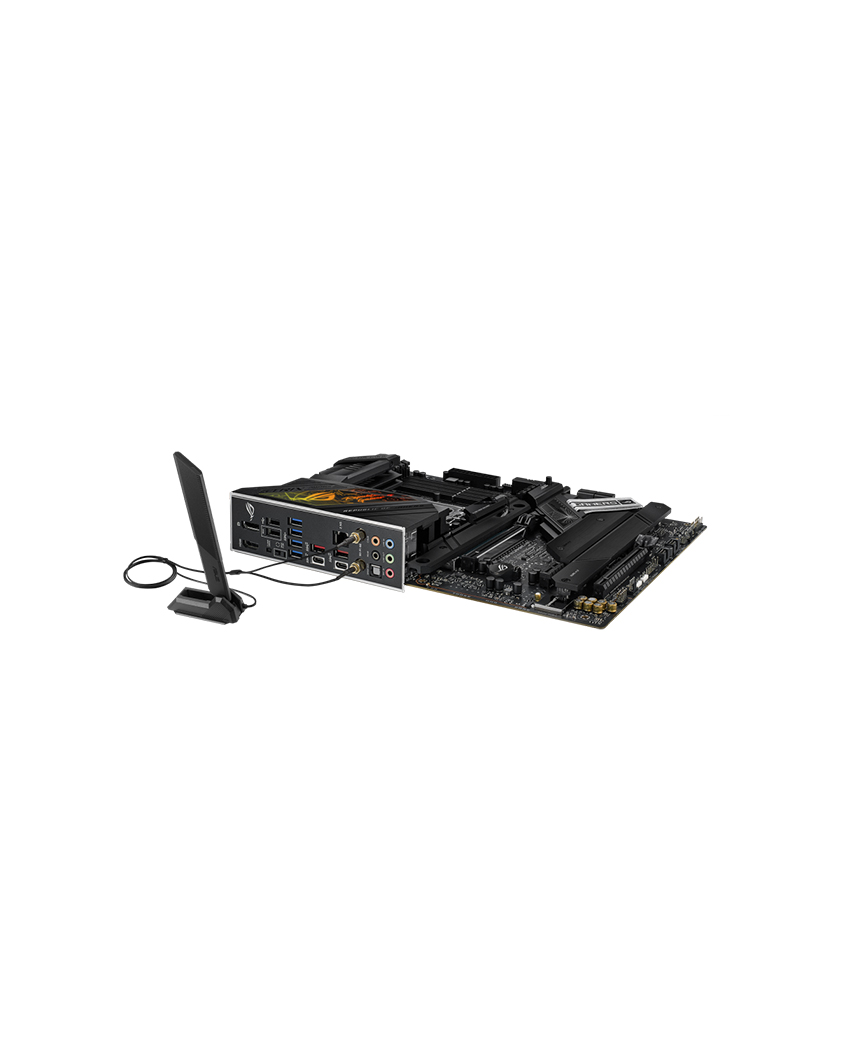 Strike stealthily with the powerfully potent ROG Strix Z790-H. Thick black heatsinks keep VRM temperatures under wraps, allowing Intel® 13th Gen processors room for higher boosts. Four M.2 slots are similarly outfitted, and the top slot comes with a combo sink to sneak in extra cooling. PCIe 5.0 support lies in wait for next-gen graphics cards, and cutting-edge WiFi 6E and USB 3.2 Gen 2×2 fully flesh out connectivity.